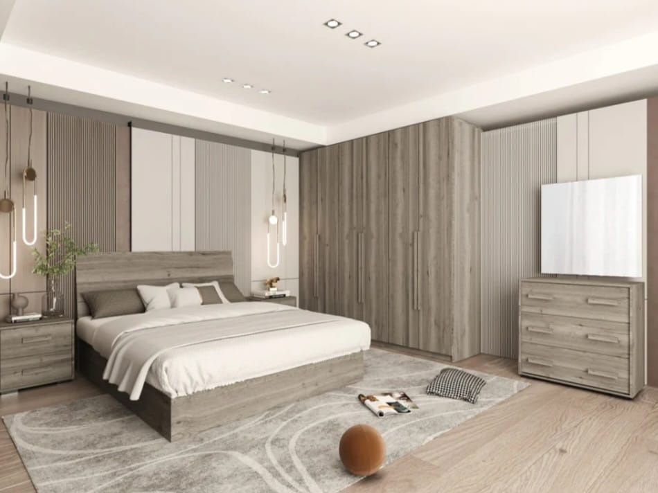 غرفة نوم ماستر خشب ام دي اف أسباني بطبقة خارجية من الميلامين باللون البني مكونة من سرير و دولاب و2 كمود و تسريحة