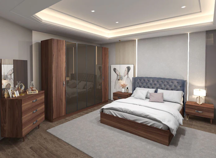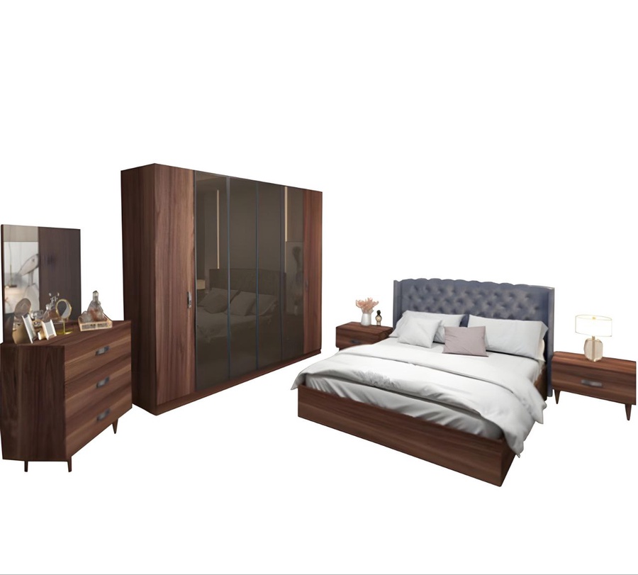 غرفة نوم ماستر خشب ام دي اف أسباني بطبقة خارجية من الميلامين باللون البني مكونة من سرير و دولاب و 2 كمود وتسريحة