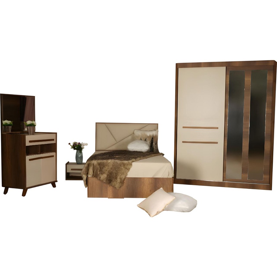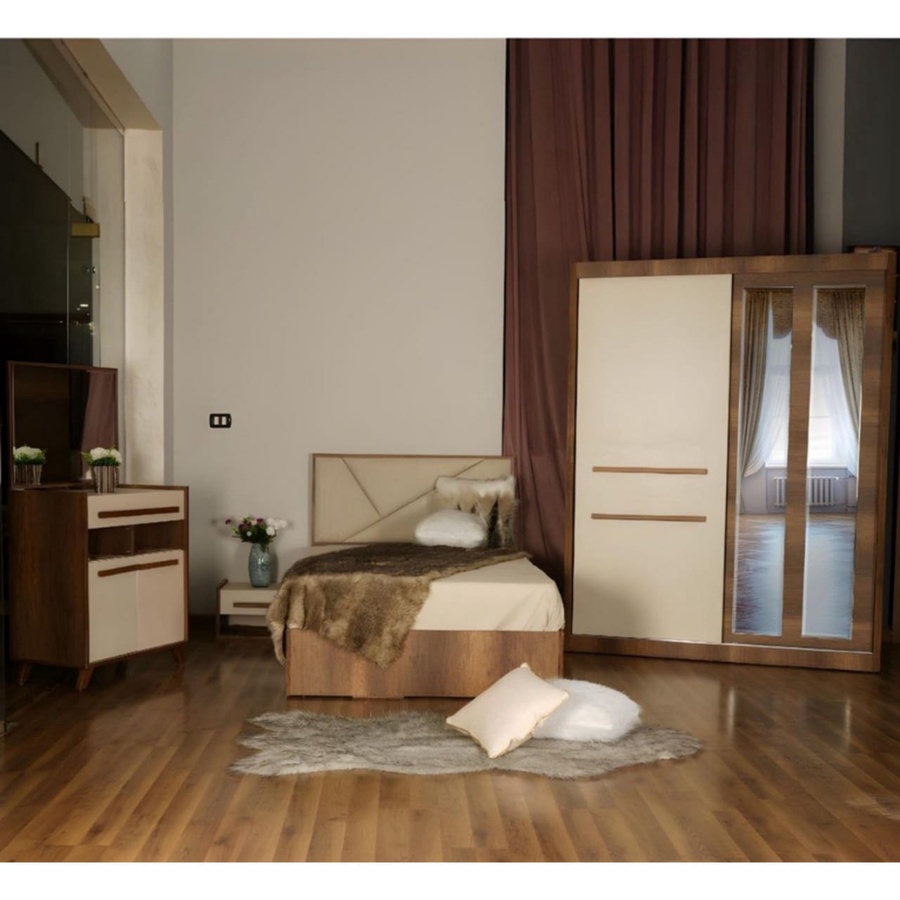غرفة نوم شبابي خشب ام دي اف أسباني بطبقة خارجية من الميلامين باللون الخشبي والبيج مكونة من سرير و دولاب و كمود وتسريحه