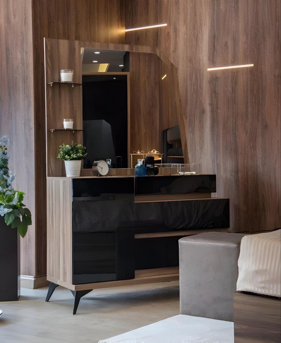 غرفة نوم ماستر خشب ام دي اف أسباني بطبقة خارجية من الميلامين باللون الخشبي والاسود مكونة من سرير و دولاب و 2 كمود وتسريحة
