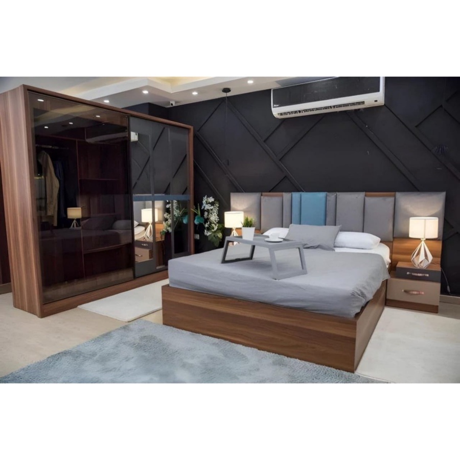 غرفة نوم ماستر خشب ام دي اف أسباني بطبقة خارجية من الميلامين باللون الخشبي والرمادى والبيج مكونة من سرير و دولاب و 2 كمود وتسريحة