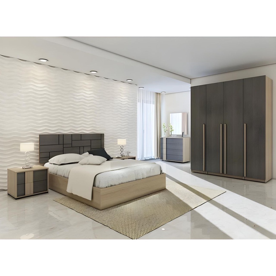 غرفة نوم ماستر خشب ام دي اف أسباني بطبقة خارجية من الميلامين باللون الخشبي والرمادى مكونة من سرير و دولاب و 2 كمود وتسريحة