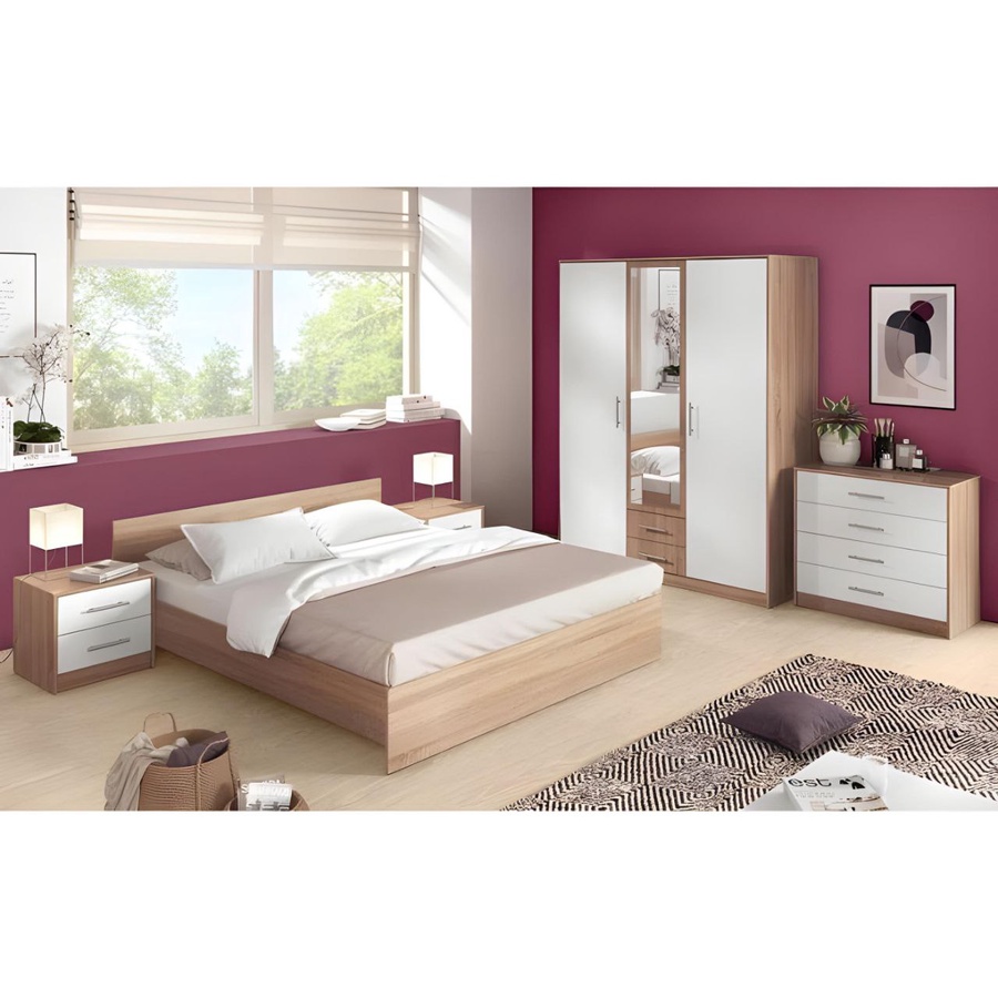 غرفة نوم ماستر خشب ام دي اف أسباني بطبقة خارجية من الميلامين باللون الخشبي والابيض مكونة من سرير و دولاب و 2 كمود وتسريحة