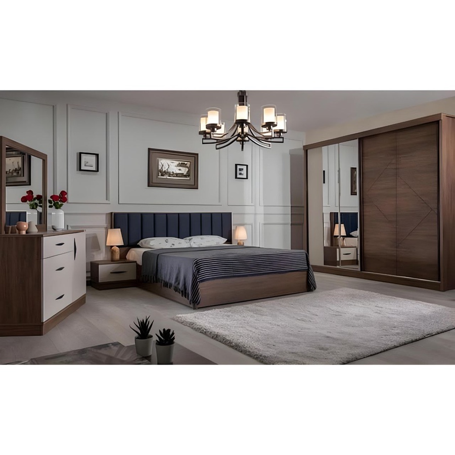 غرفة نوم ماستر خشب ام دي اف أسباني بطبقة خارجية من الميلامين باللون البني والابيض مكونة من سرير و دولاب و 2 كمود وتسريحة