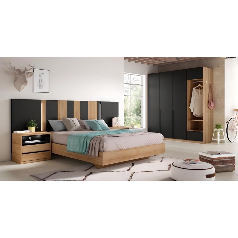 غرفة نوم ماستر خشب ام دي اف أسباني بطبقة خارجية من الميلامين باللون الخشبي والاسود مكونة من سرير و دولاب و 2 كمود