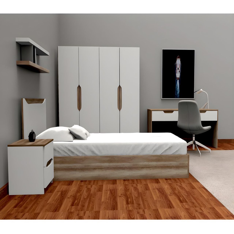 غرفة نوم شبابي خشب ام دي اف أسباني بطبقة خارجية من الميلامين باللون الابيض والخشبي مكونة من سرير و دولاب و كمود ومكتب