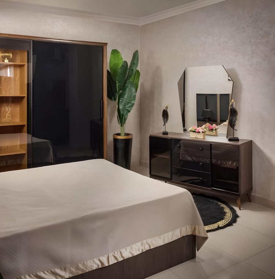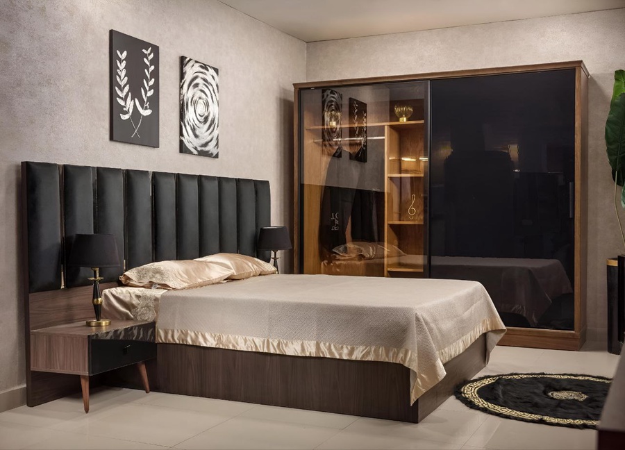 غرفة نوم ماستر خشب ام دي اف أسباني بطبقة خارجية من الميلامين باللون الخشبي والاسود مكونة من سرير و دولاب و 2 كمود وتسريحة