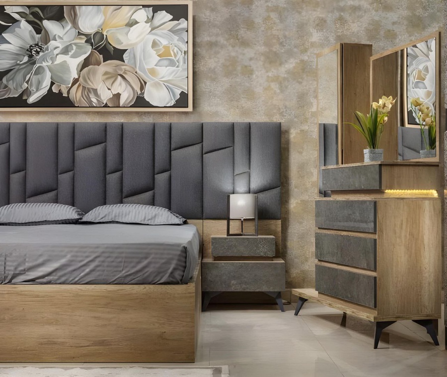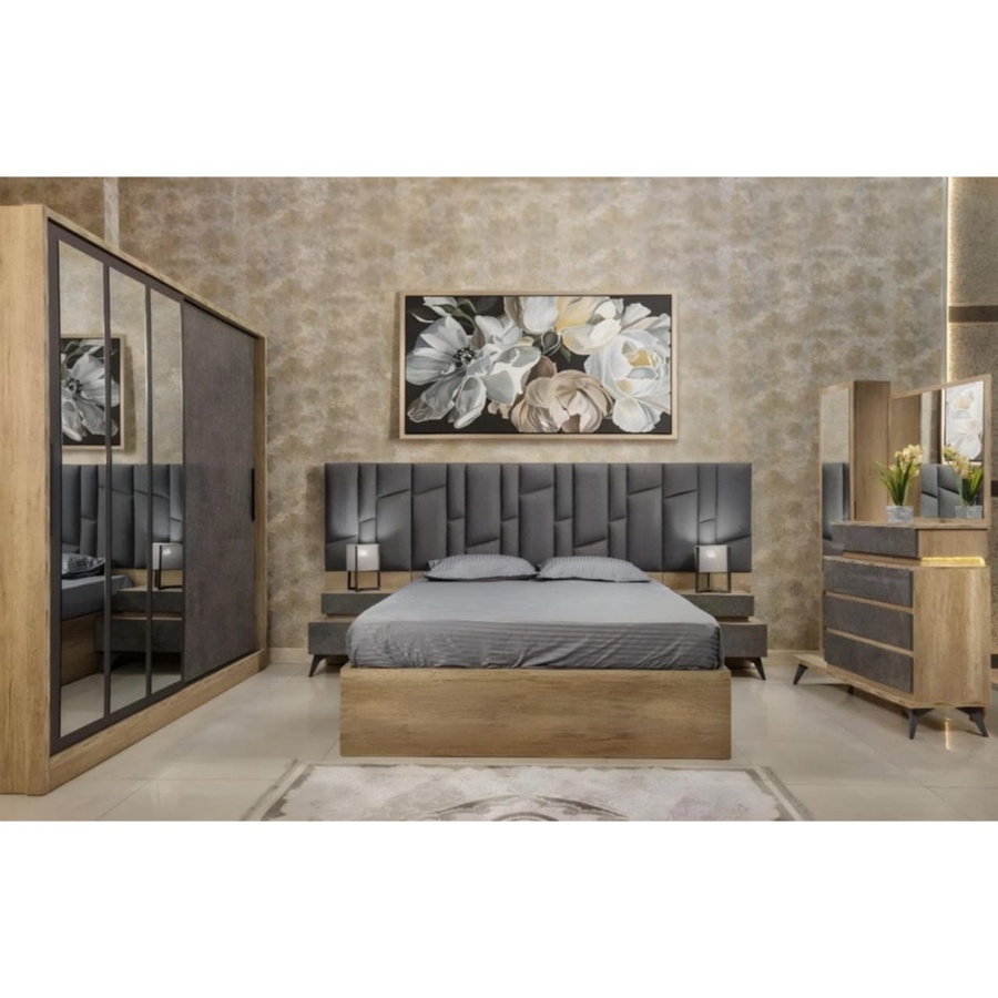 غرفة نوم ماستر خشب ام دي اف أسباني بطبقة خارجية من الميلامين باللون الخشبي والرمادى مكونة من سرير و دولاب و 2 كمود وتسريحة