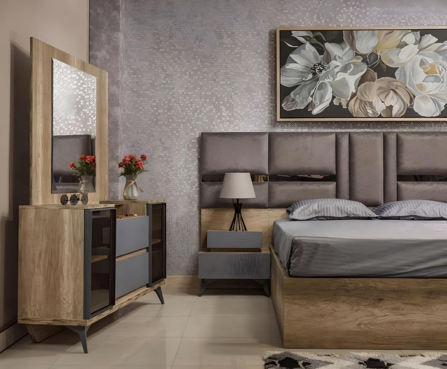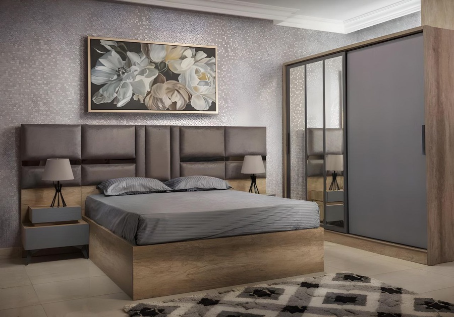 غرفة نوم ماستر خشب ام دي اف أسباني بطبقة خارجية من الميلامين باللون الخشبي والرمادى مكونة من سرير و دولاب و 2 كمود وتسريحة