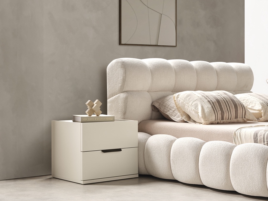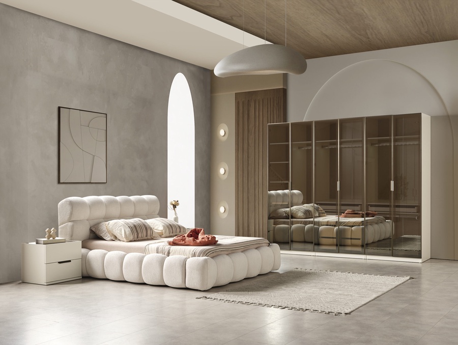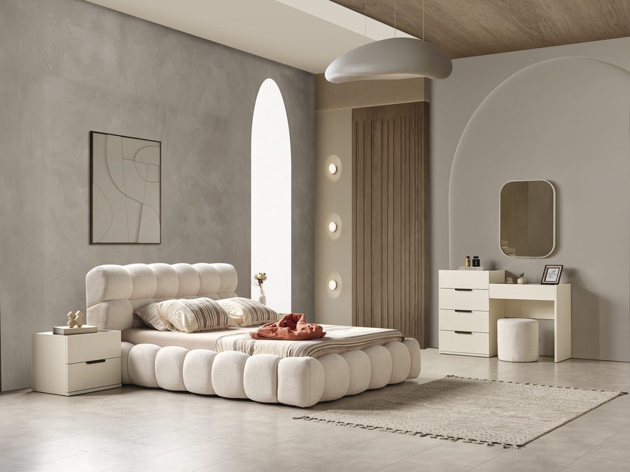 غرفة نوم ماستر خشب ام دي اف أسباني بطبقة خارجية من الميلامين باللون الابيض مكونة من سرير و دريسنج و 2 كمود وتسريحة