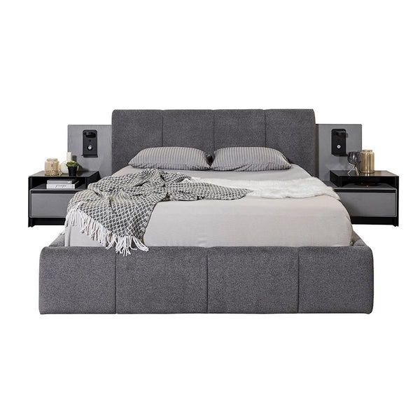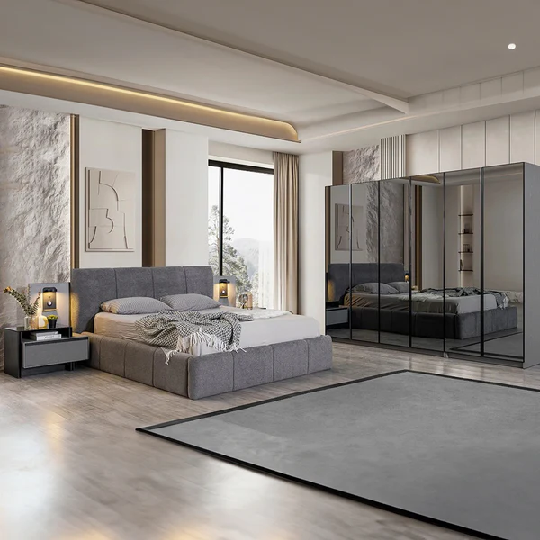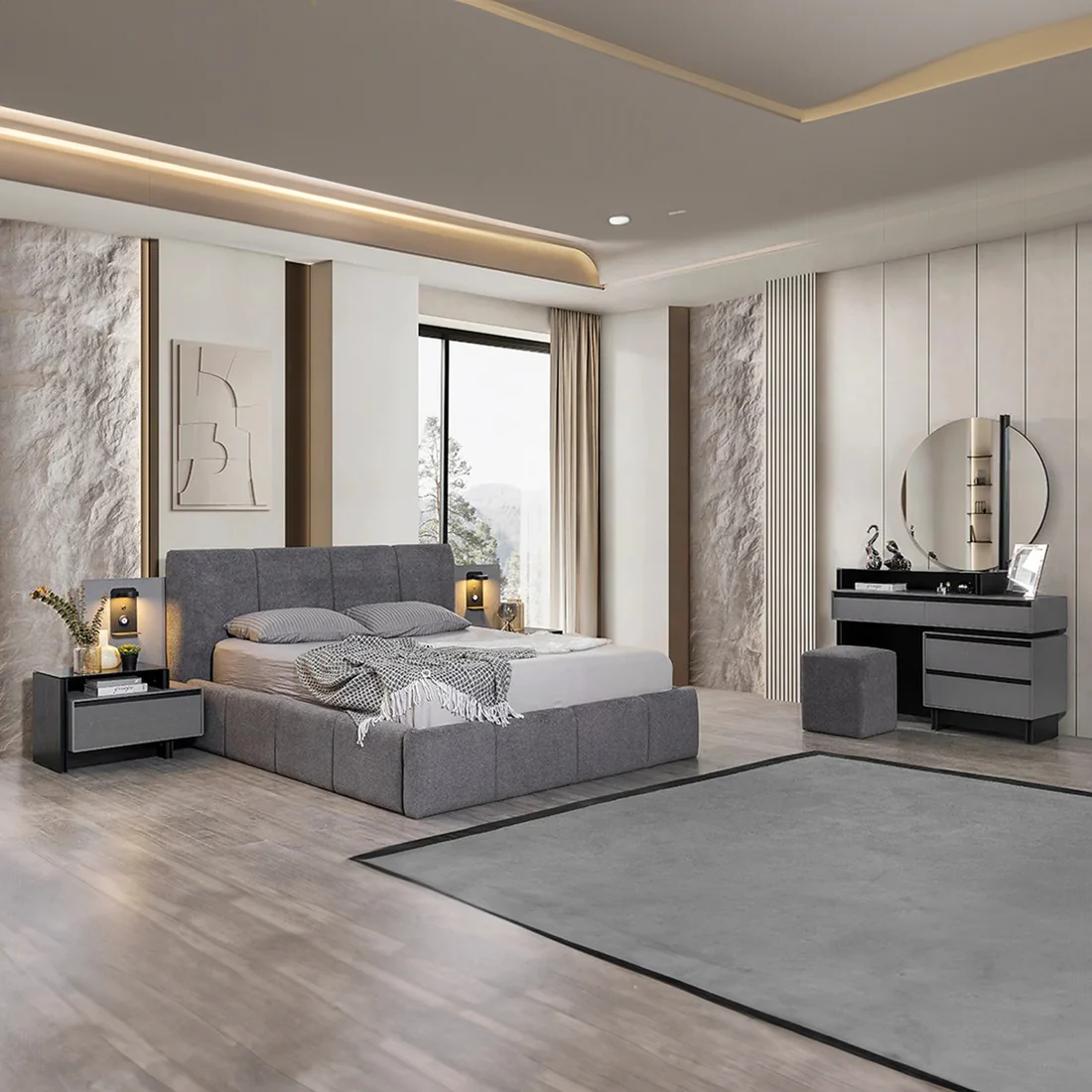 غرفة نوم ماستر خشب ام دي اف أسباني بطبقة خارجية من الميلامين باللون الرمادى والاسود مكونة من سرير و دريسنج و 2 كمود وتسريحة
