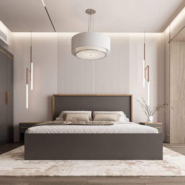 غرفة نوم ماستر خشب ام دي اف أسباني بطبقة خارجية من الميلامين باللون الرمادى والخشبي مكونة من سرير و دولاب و 2 كمود وتسريحة
