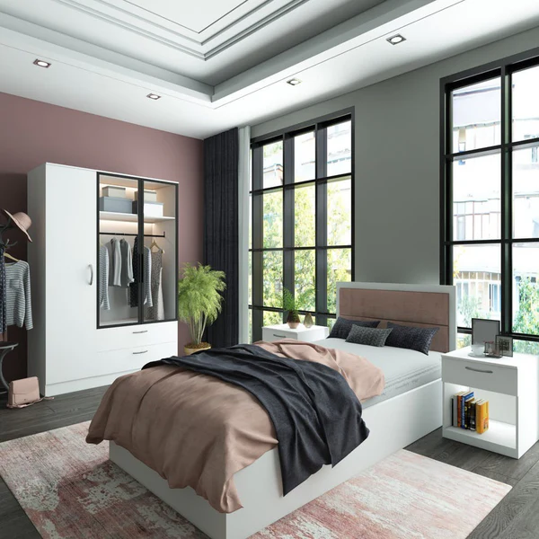 غرفة نوم شبابي خشب ام دي اف أسباني بطبقة خارجية من الميلامين باللون الابيض مكونة من سرير و دولاب و2 كمود
