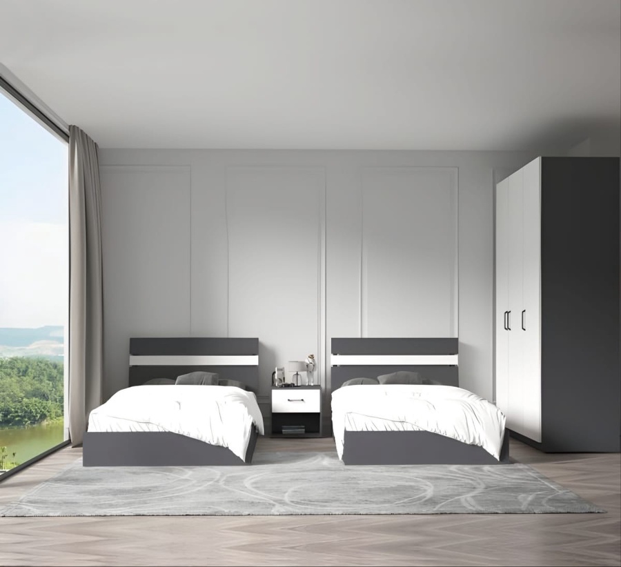 غرفة نوم شبابي خشب ام دي اف أسباني بطبقة خارجية من الميلامين باللون الابيض والرمادى مكونة من 2 سرير و دولاب و كمود
