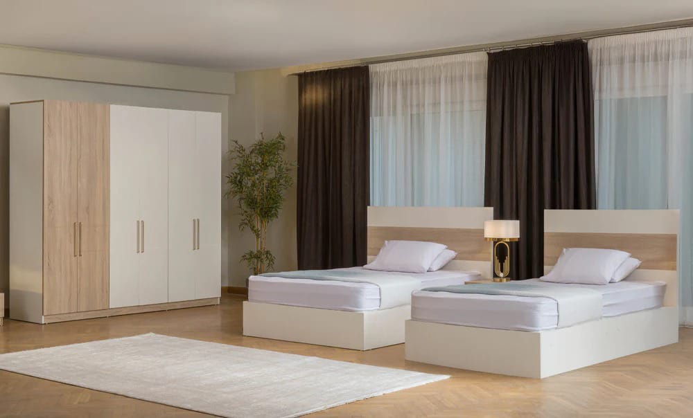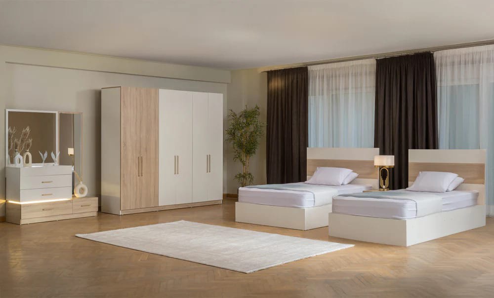 غرفة نوم شبابي خشب ام دي اف أسباني بطبقة خارجية من الميلامين باللون الابيض والخشبي مكونة من 2 سرير و دولاب و كمود وتسريحة