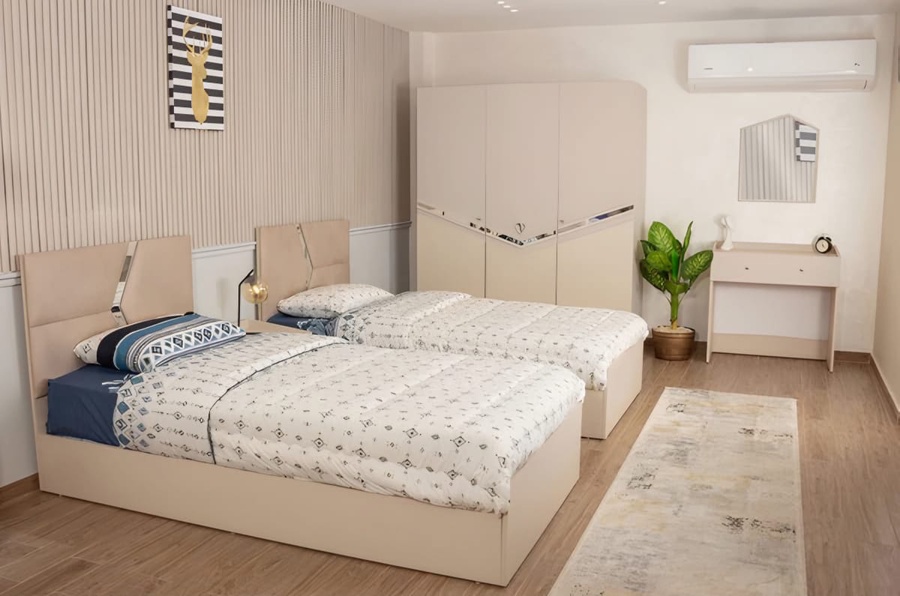 غرفة نوم شبابي خشب ام دي اف أسباني بطبقة خارجية من الميلامين باللون البيج مكونة من 2 سرير و دولاب و كمود وتسريحة