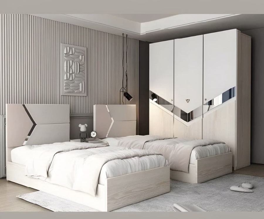 غرفة نوم شبابي خشب ام دي اف أسباني بطبقة خارجية من الميلامين باللون البيج مكونة من 2 سرير و دولاب و كمود وتسريحة
