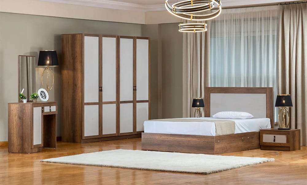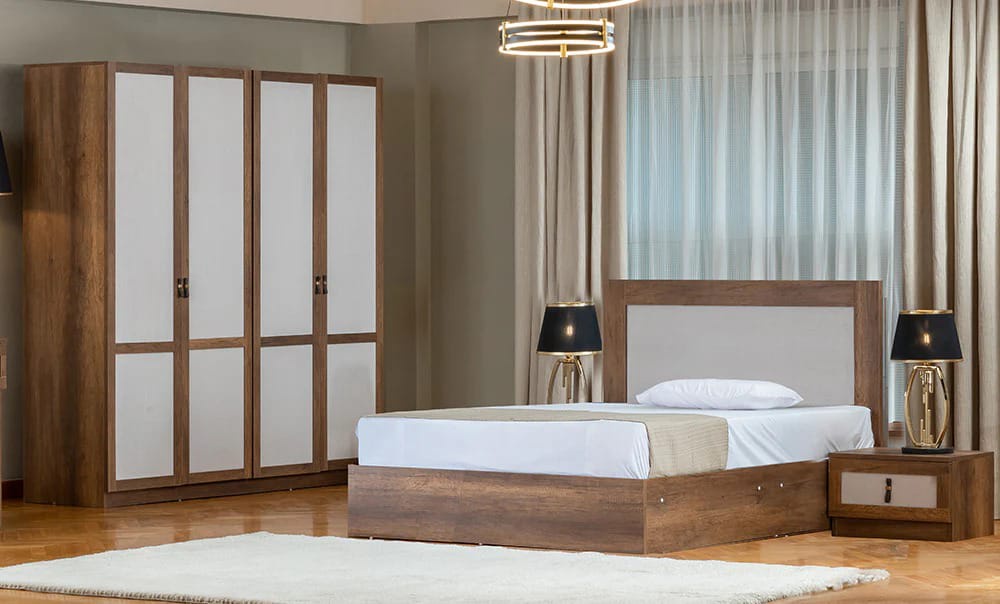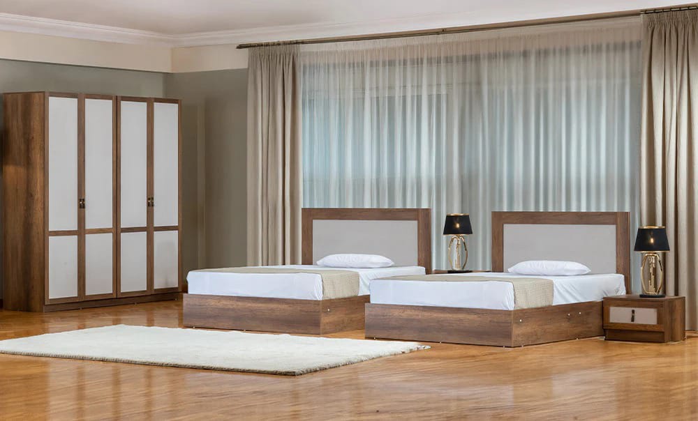 غرفة نوم شبابي خشب ام دي اف أسباني بطبقة خارجية من الميلامين باللون الابيض والخشبي مكونة من 2 سرير و دولاب و 2 كمود وتسريحة