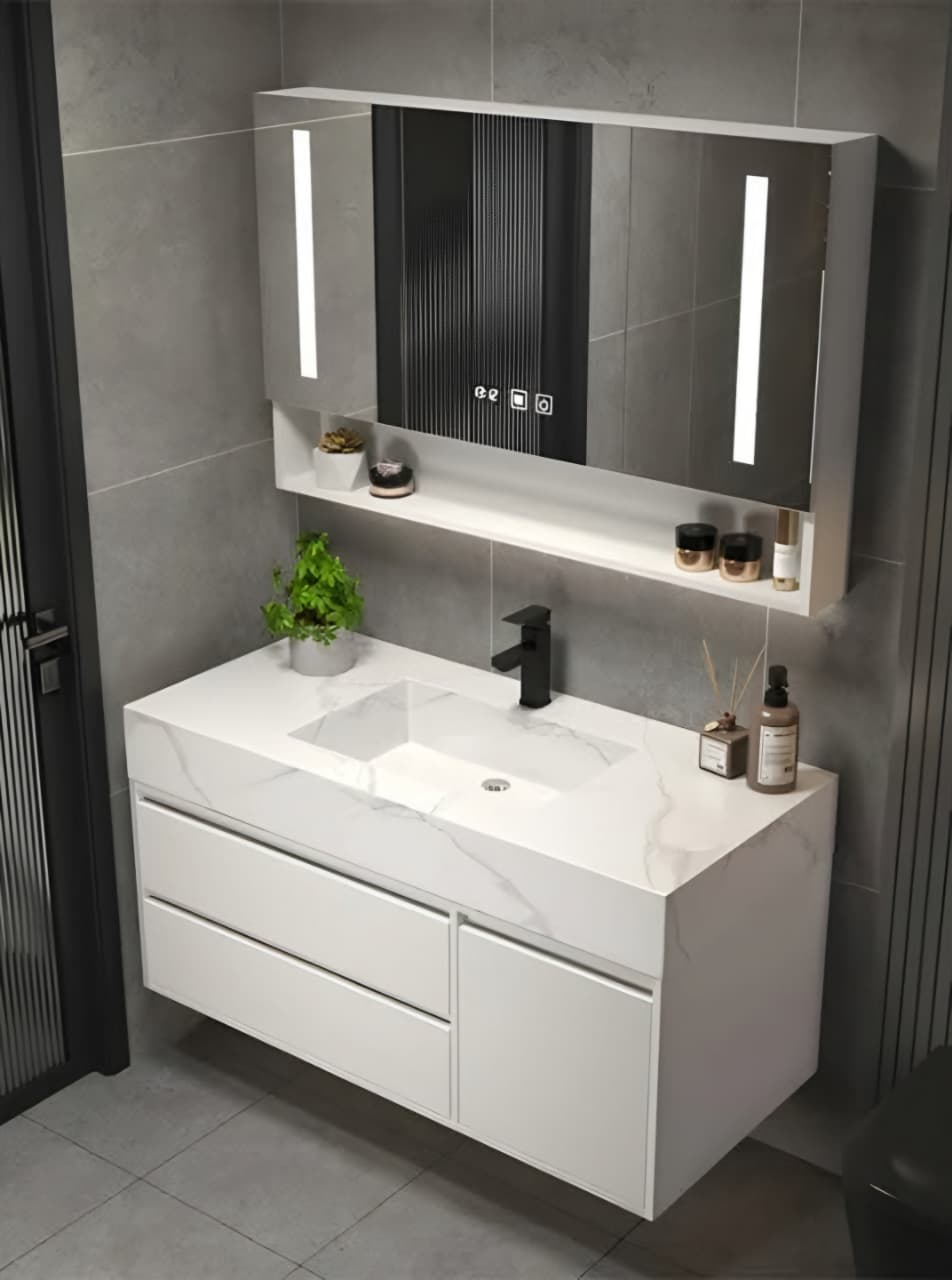 وحدة حمام معلقة من البورديوم باللون الأبيض بها 2درج ودرفة