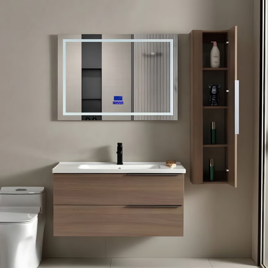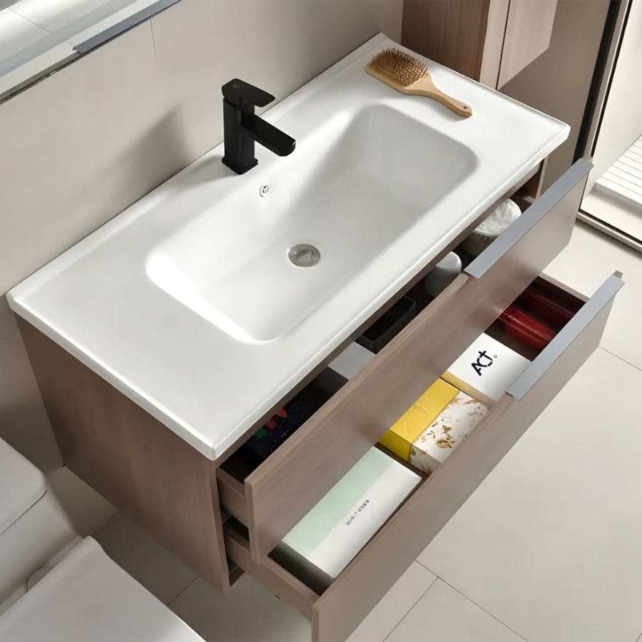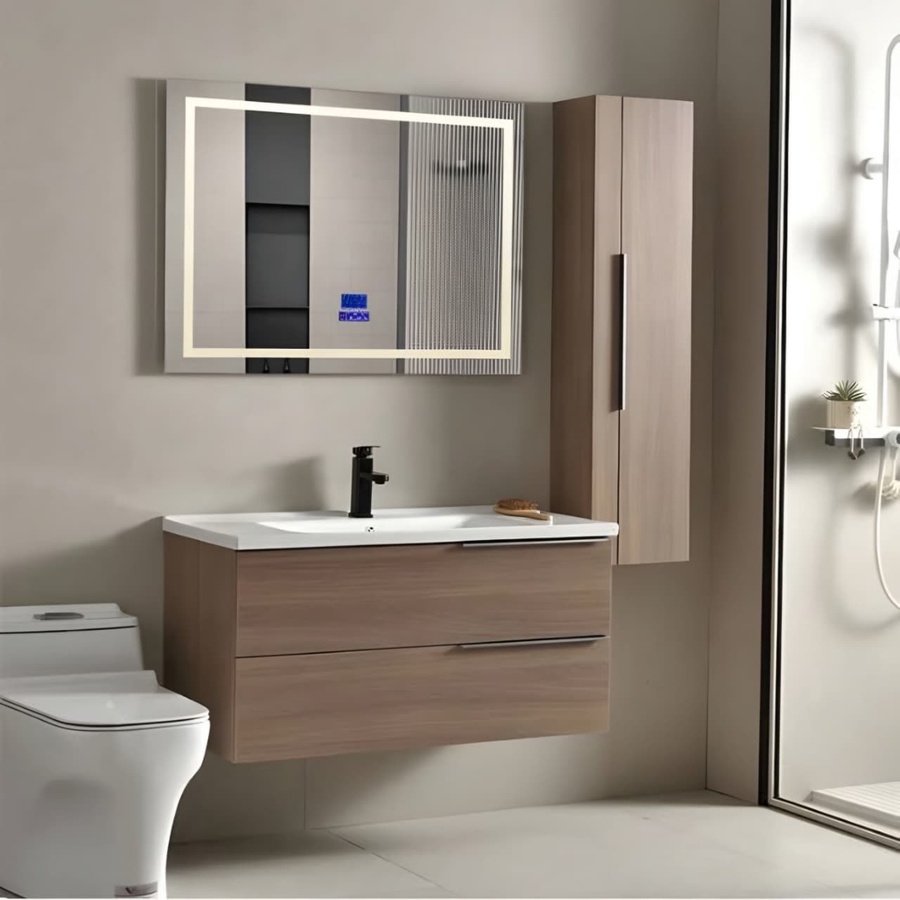 وحدة حمام معلقة من البورديوم باللون الخشبي بها 2درج مع وحدة تخزين معلقة