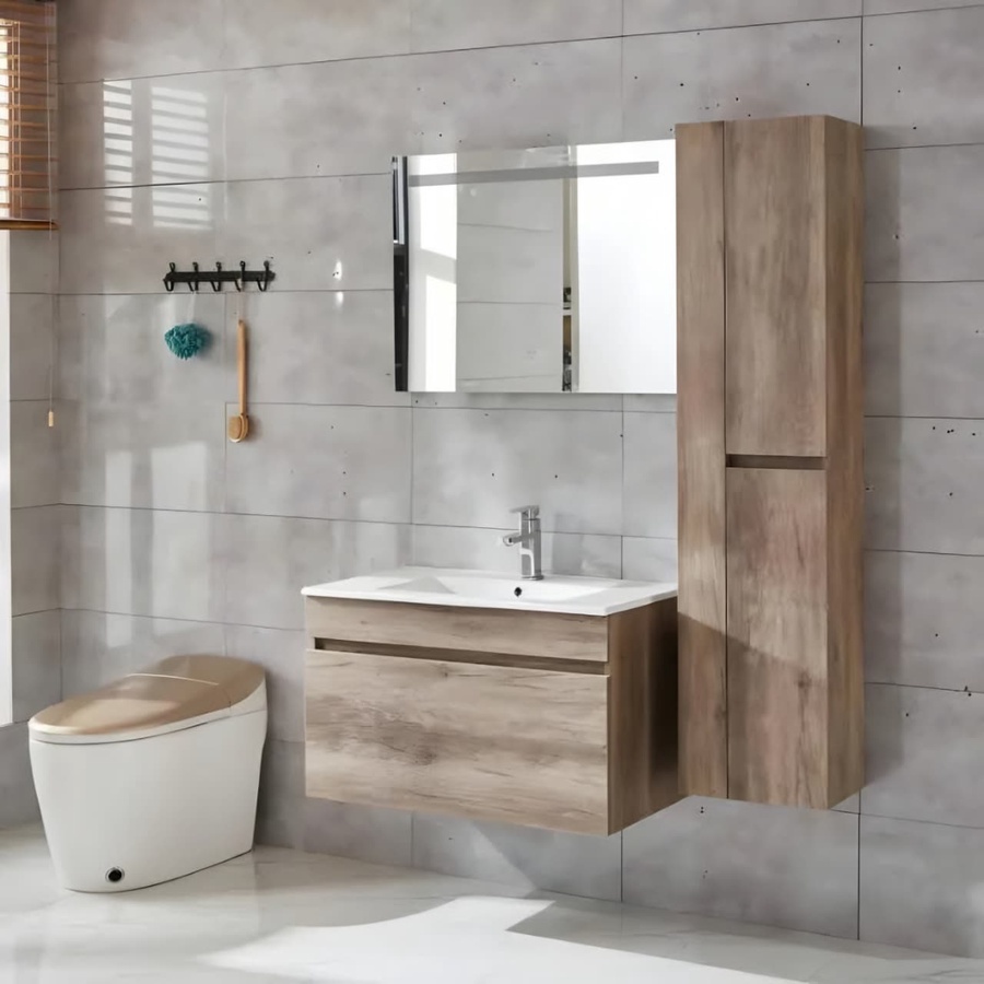 وحدة حمام معلقة من البورديوم باللون الخشبي بها درج مع وحدة تخزين معلقة