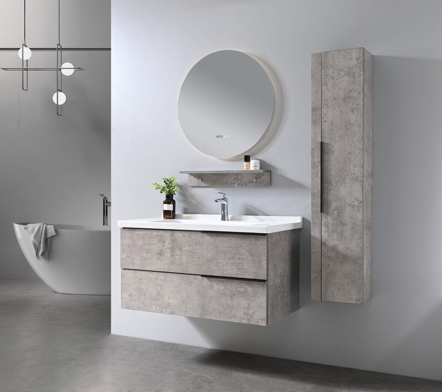 وحدة حمام معلقة من البورديوم باللون الخشبي بها 2 درج مع وحدة تخزين معلقة