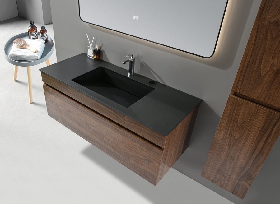 وحدة حمام معلقة من البورديوم باللون الخشبي بها درج مع وحدة تخزين معلقة