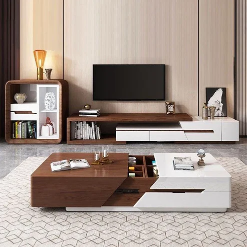 ترابيزة ووحدة تليفزيون من الخشب الام دي اف أسباني بطبقة خارجية من الميلامين باللون الابيض واللون الخشبي