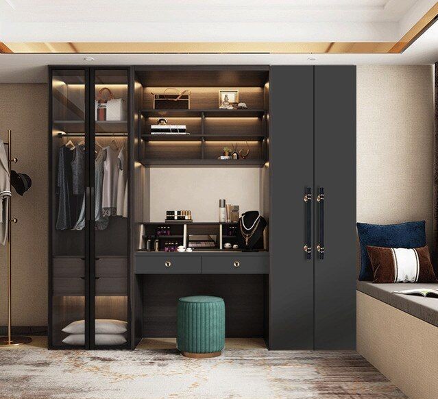 دولاب مفصلي من خشب الا م دي اف أسباني بطبقة خارجية من الميلامين باللون الرمادي يتكون من 2ضلفة خشب مفصلي و2 ضلفة زجاج بني مفصلي ويحتوي ع أماكن تعليق الملابس و مجموعة من الارفف الداخلية و2 درج داخلي وملحق معه تسريحة بها مراية و2 درج ومجموعة ارفف معلقة وبف